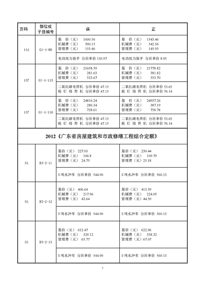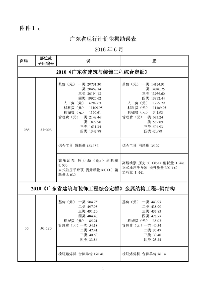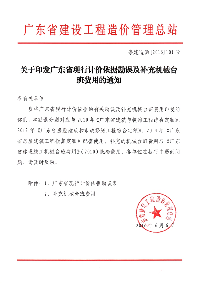 附件:1、廣東省現行計價依據勘誤表 2、補充機械臺班費用