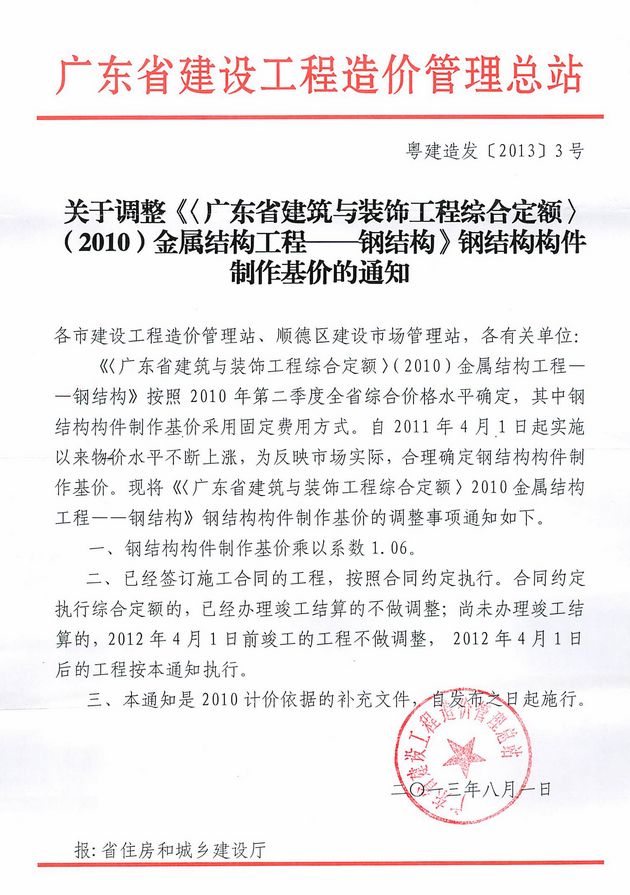 關于調整《〈廣東省建筑與裝飾工程綜合定額〉(2010)金屬結構工程——鋼結構》鋼結構構件制作基價的通知