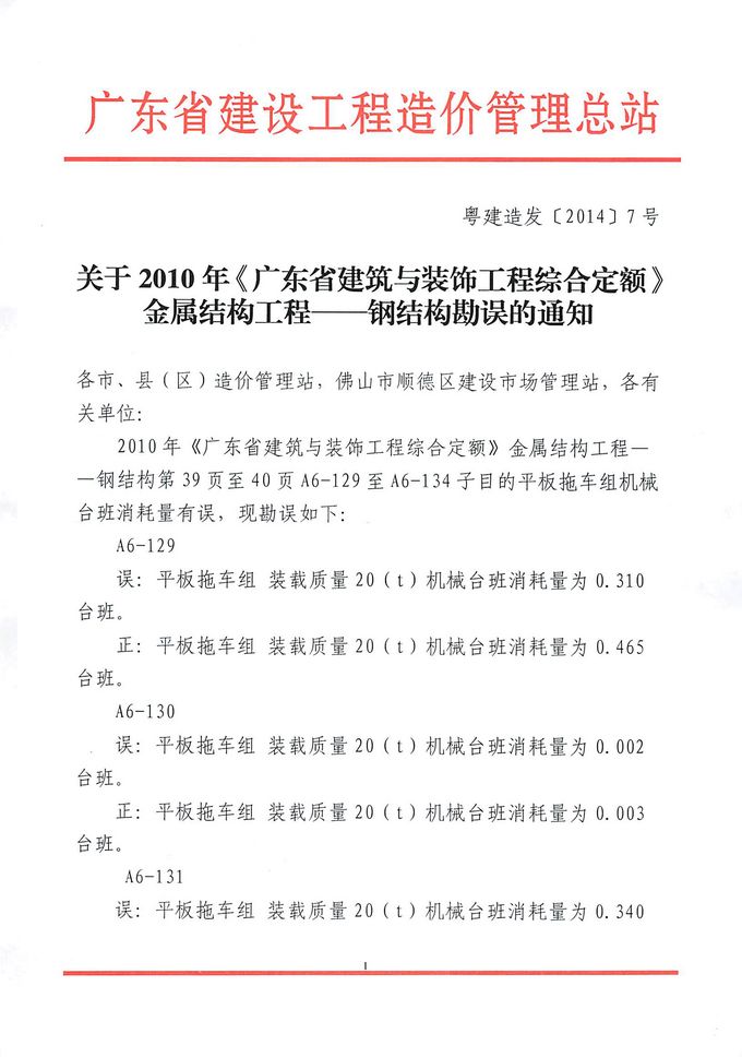 關于2010年《廣東省建筑與裝飾工程綜合定額》金屬結構工程——鋼結構勘誤的通知