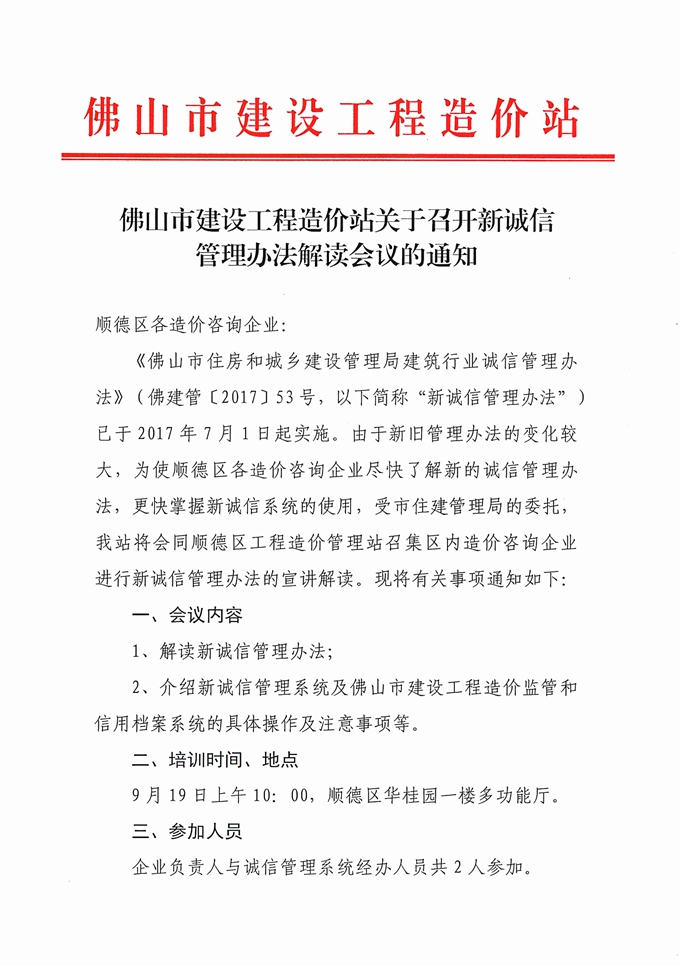 佛山市建設(shè)工程造價(jià)站關(guān)于召開新誠(chéng)信管理辦法解讀會(huì)議的通知