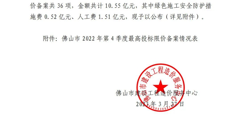 佛山市建設(shè)工程造價服務(wù)中心關(guān)于公開2022年第4季度佛山市最高投標限價備案情況的通知