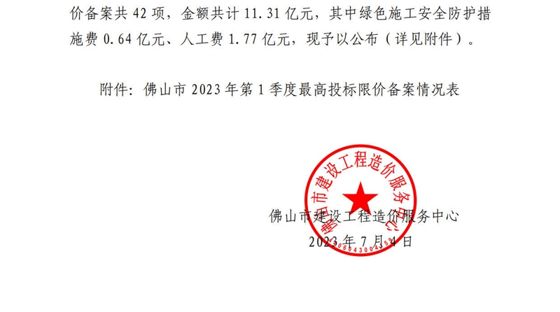 佛山市建設工程造價服務中心關于公開2023年第1季度佛山市最高投標限價備案情況的通知