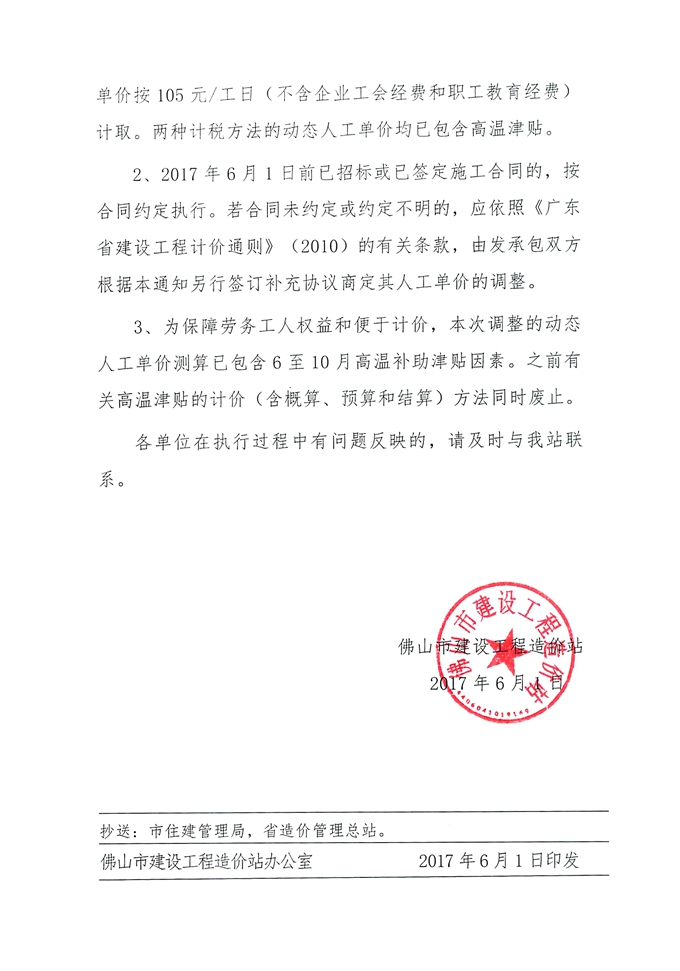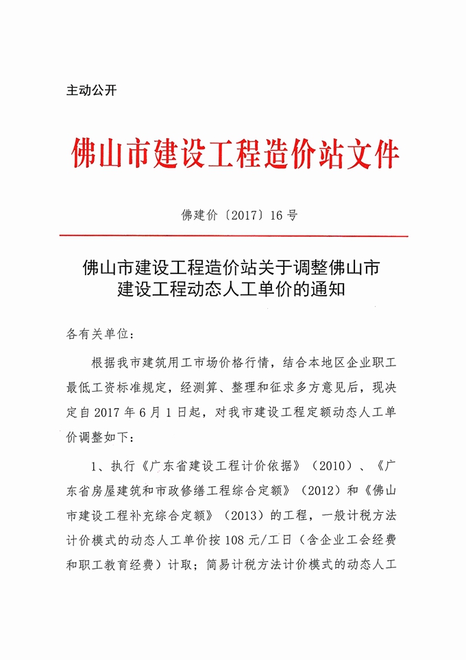 佛山市建設工程造價站關于調整佛山市建設工程動態人工單價的通知