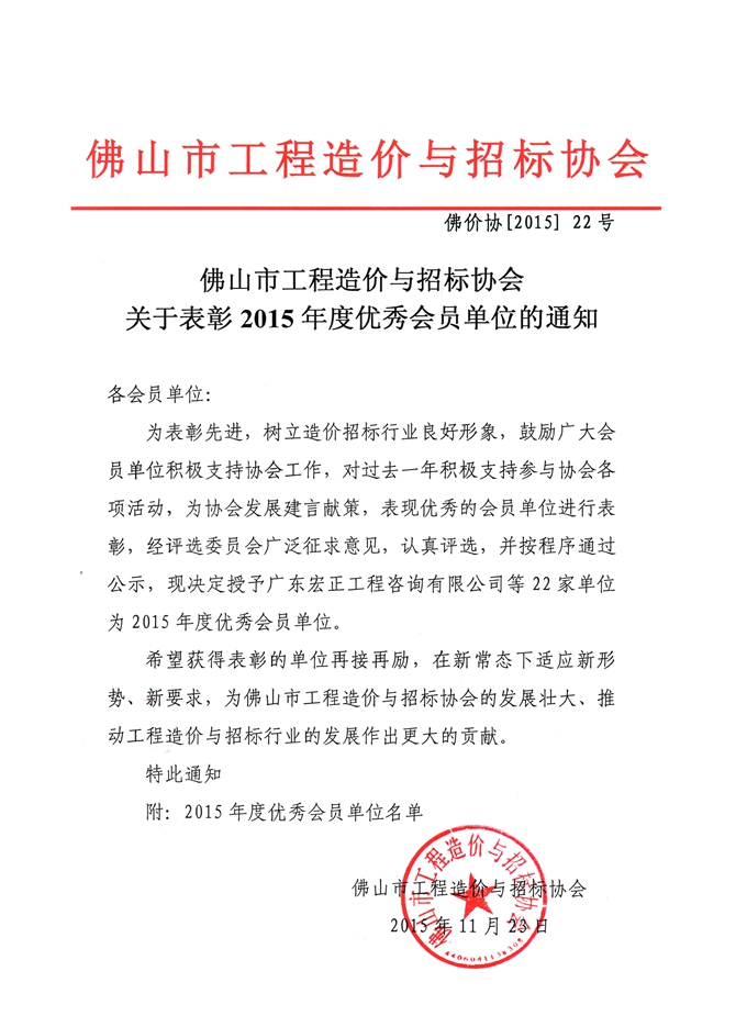 佛山市工程造價(jià)與招標(biāo)協(xié)會(huì)關(guān)于表彰2015年度優(yōu)秀會(huì)員單位的通知