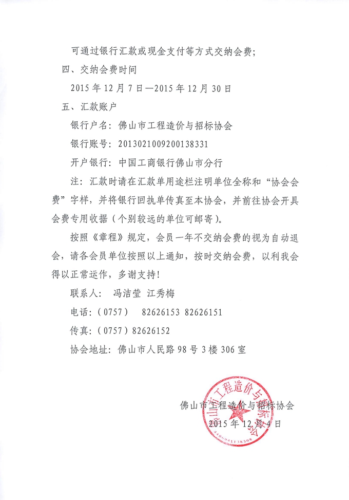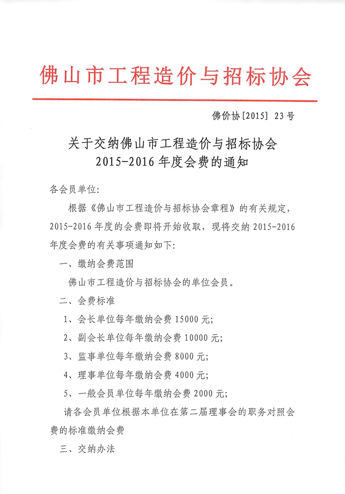 關于交納佛山市工程造價與招標協會2015-2016年度會費的通知