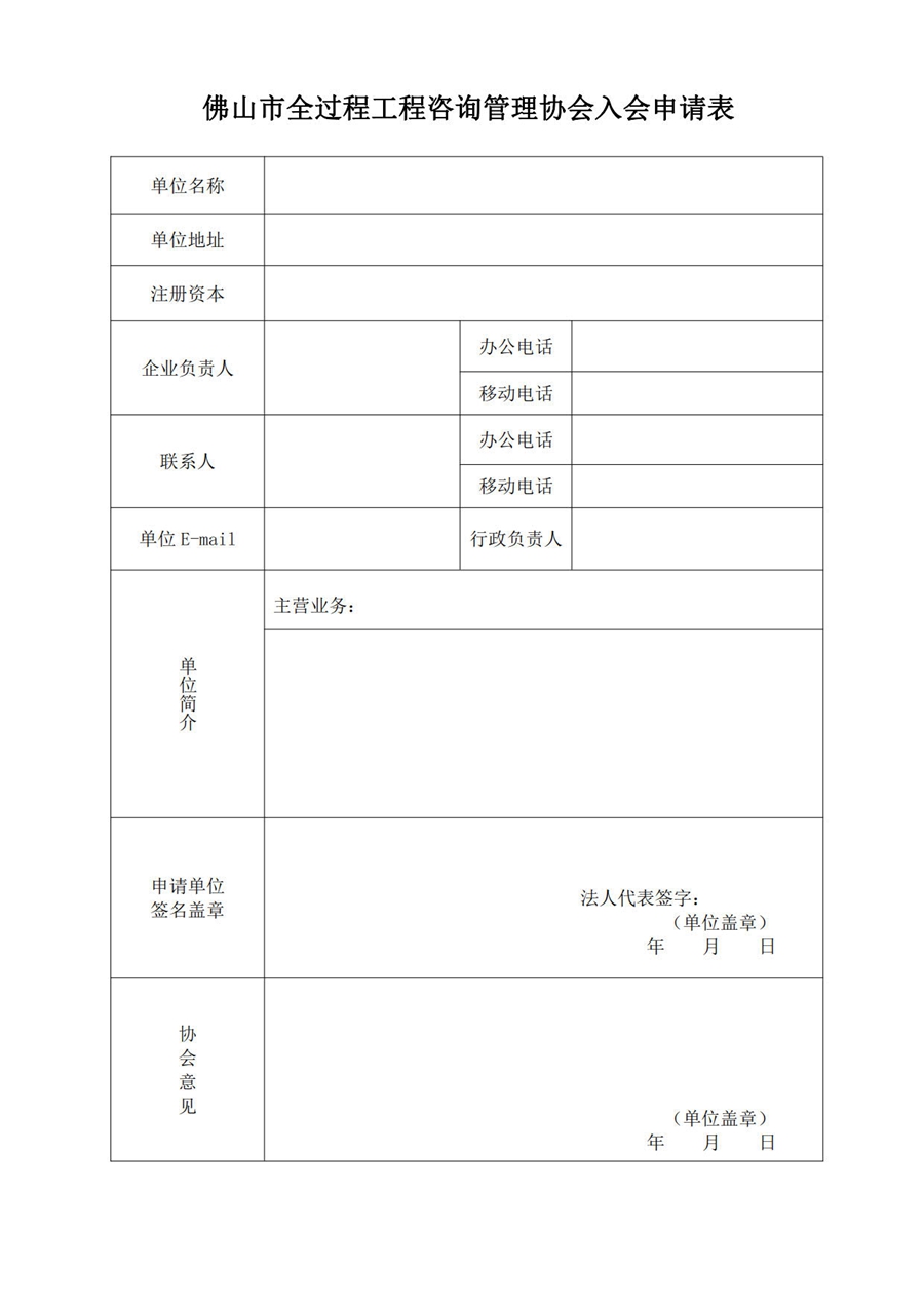 佛山市全過程工程咨詢管理協(xié)會(huì)入會(huì)申請(qǐng)表