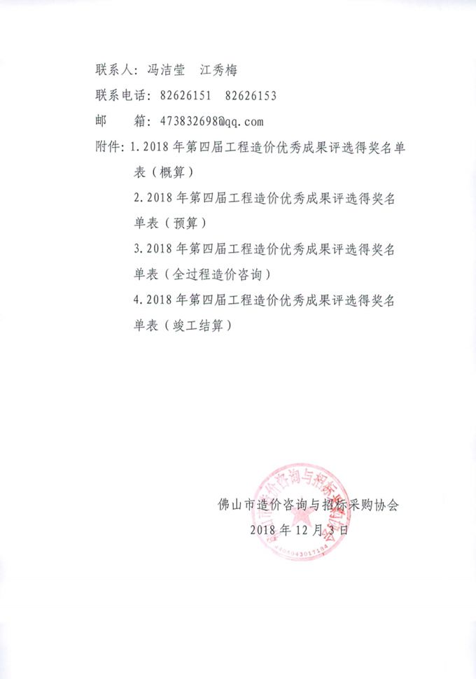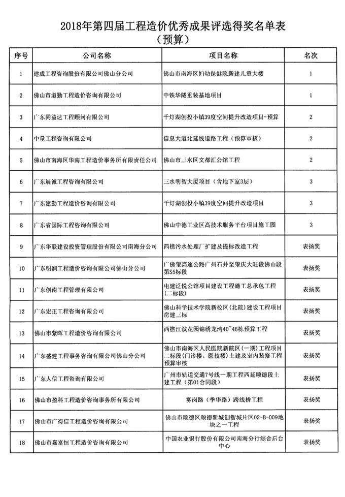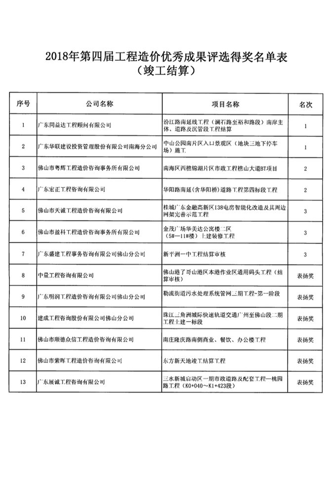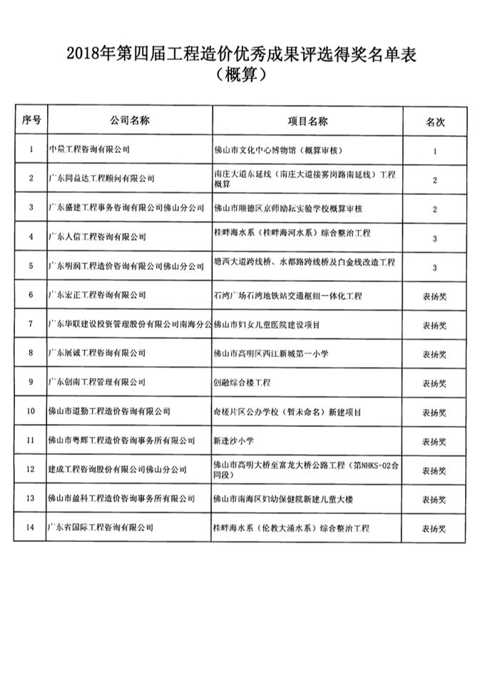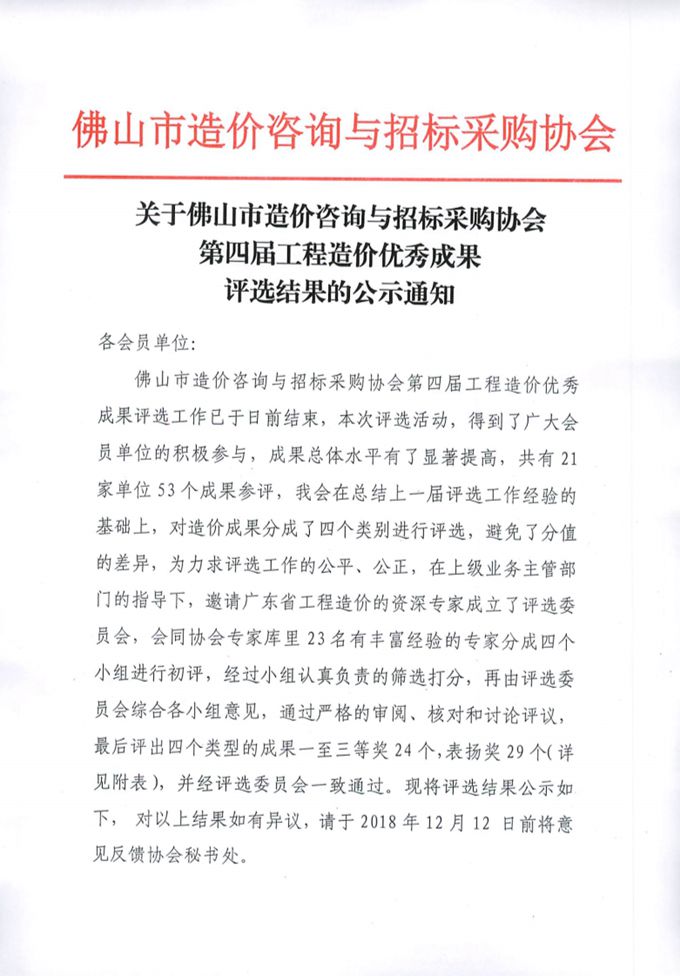 關(guān)于佛山市造價(jià)咨詢與招標(biāo)采購協(xié)會(huì)第四屆工程造價(jià)優(yōu)秀成果評選結(jié)果的公示通知