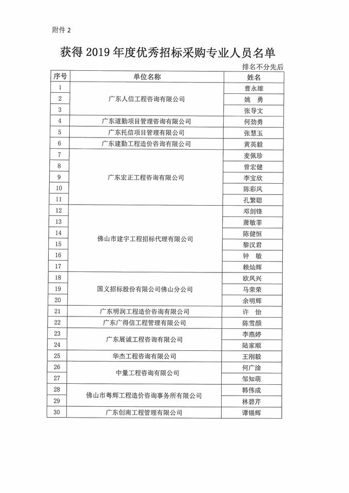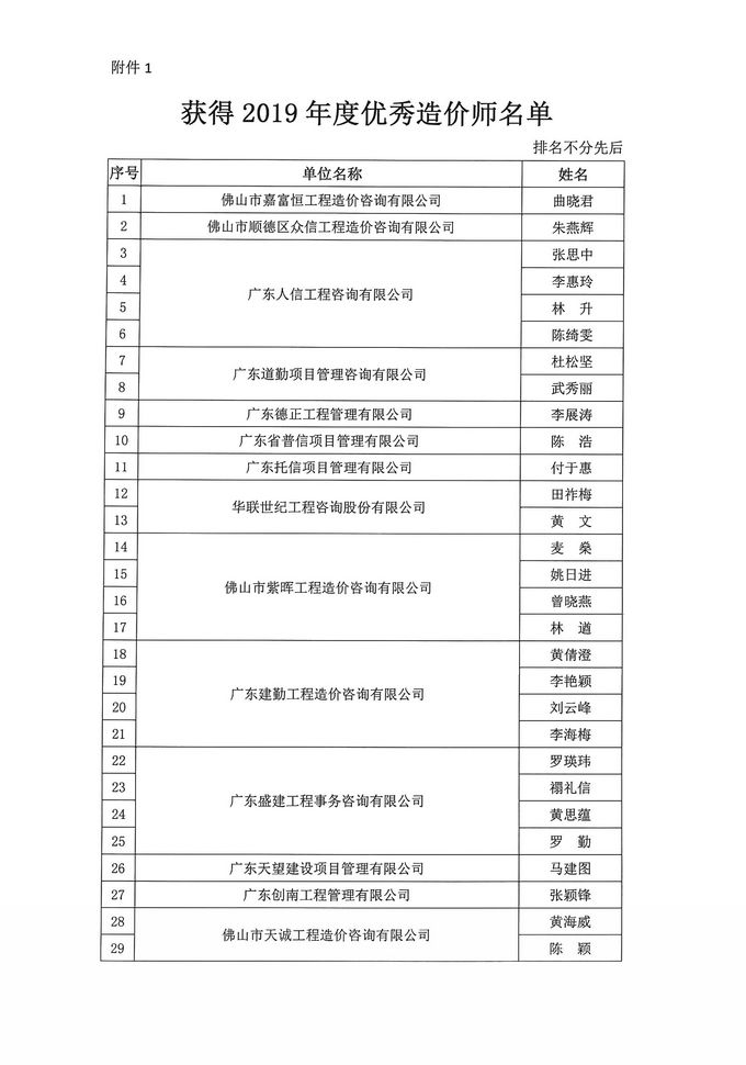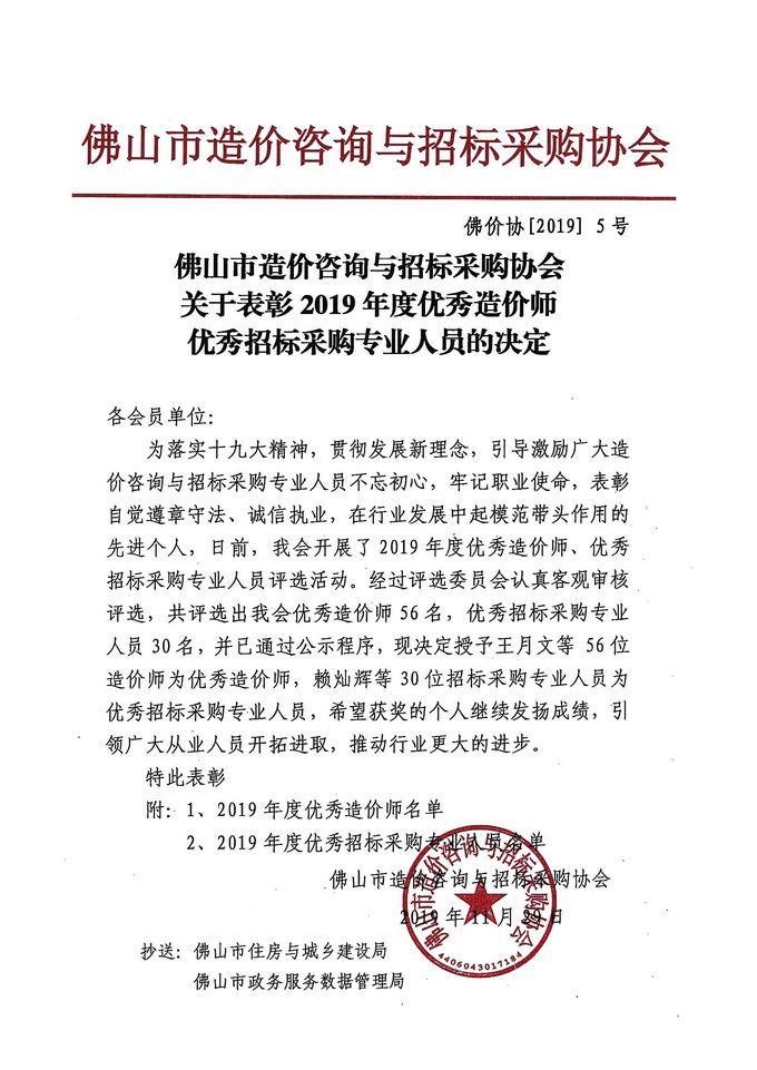 佛山市造價咨詢與招標采購協會關于表彰2019年度優秀造價師優秀招標采購專業人員的決定