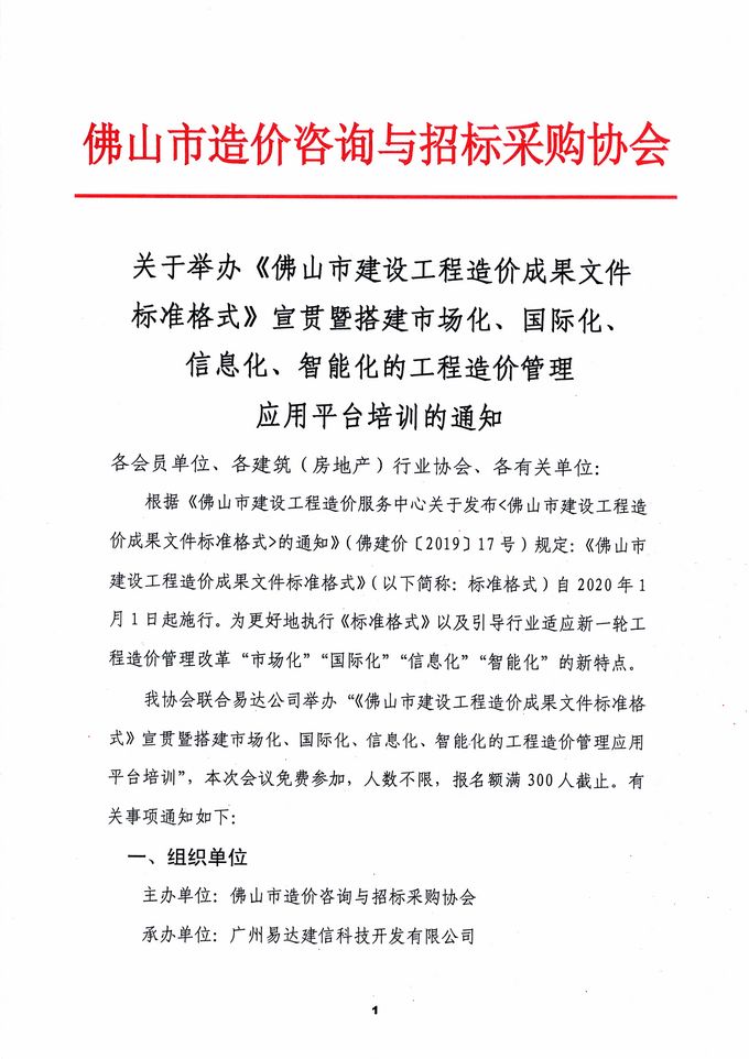 關于舉辦《佛山市建設工程造價成果文件標準格式》宣貫暨搭建市場化、國際化、信息化、智能化的工程造價管理應用平臺培訓的通知