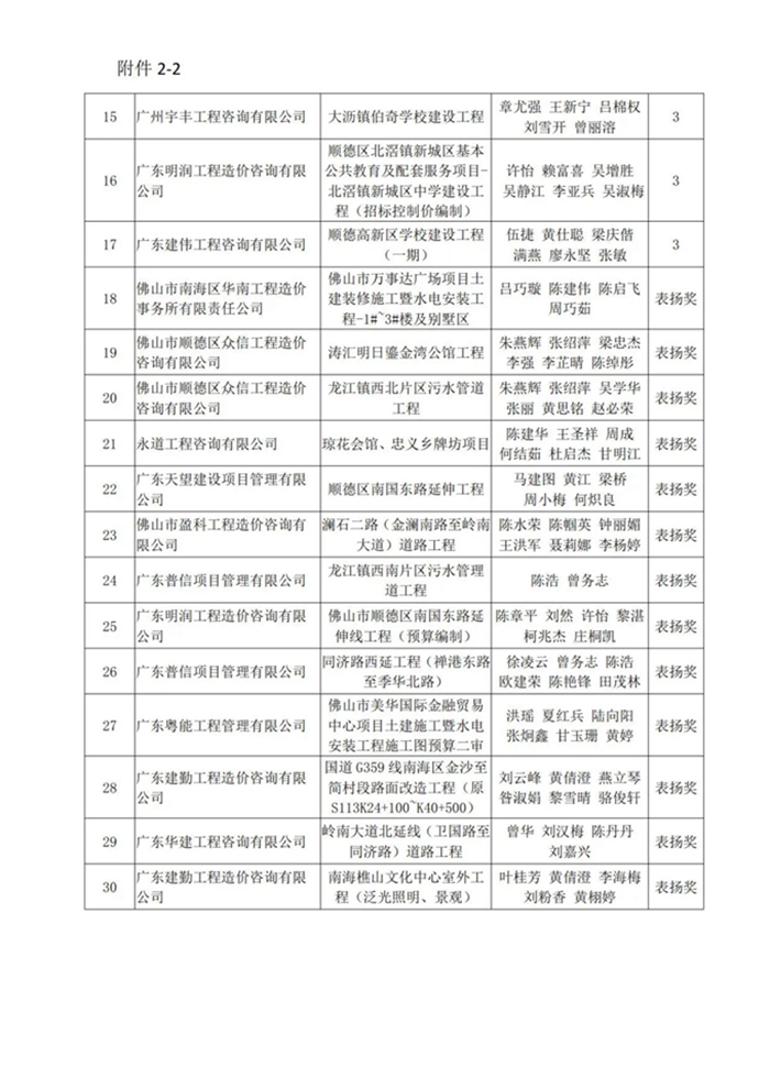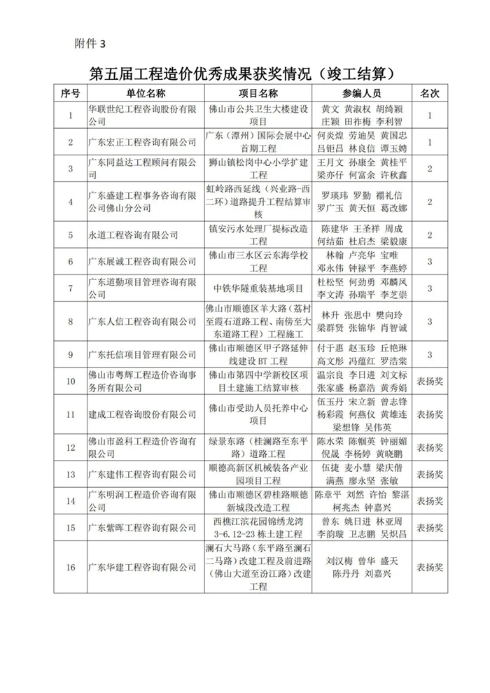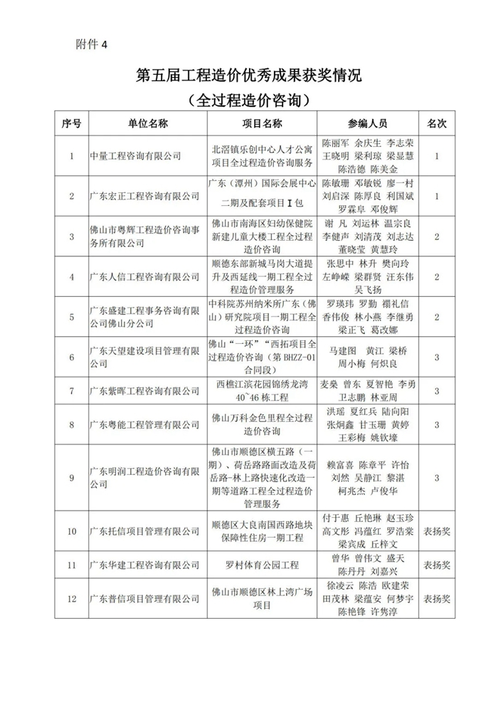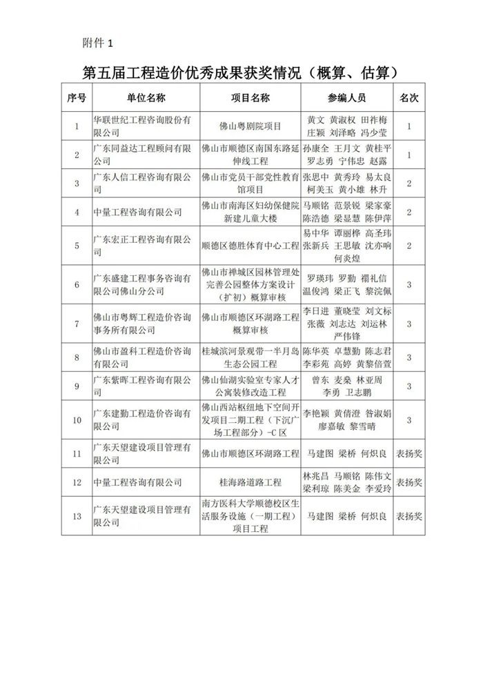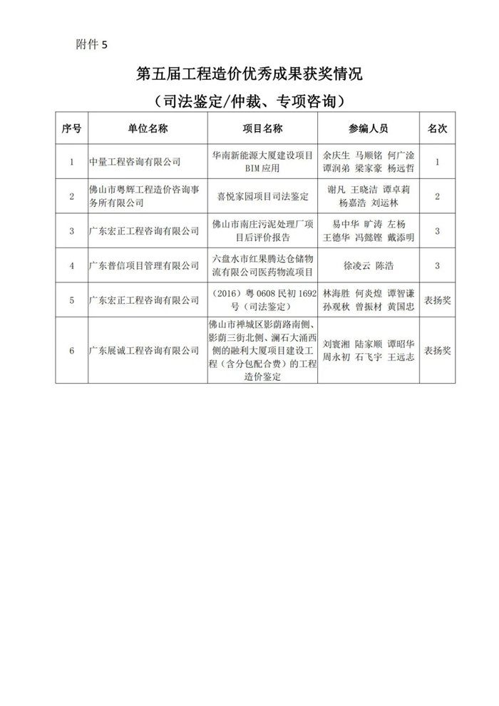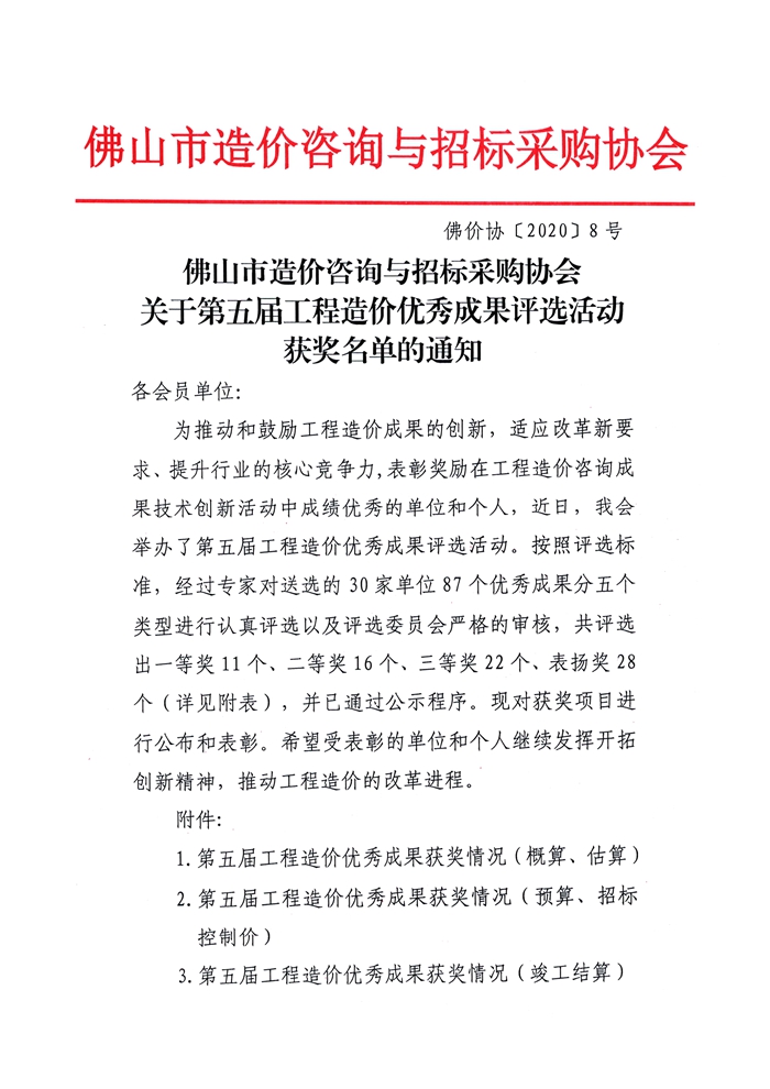 佛山市造價咨詢與招標采購協會關于第五屆工程造價優秀成果評選活動獲獎名單的通知