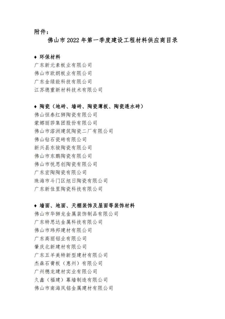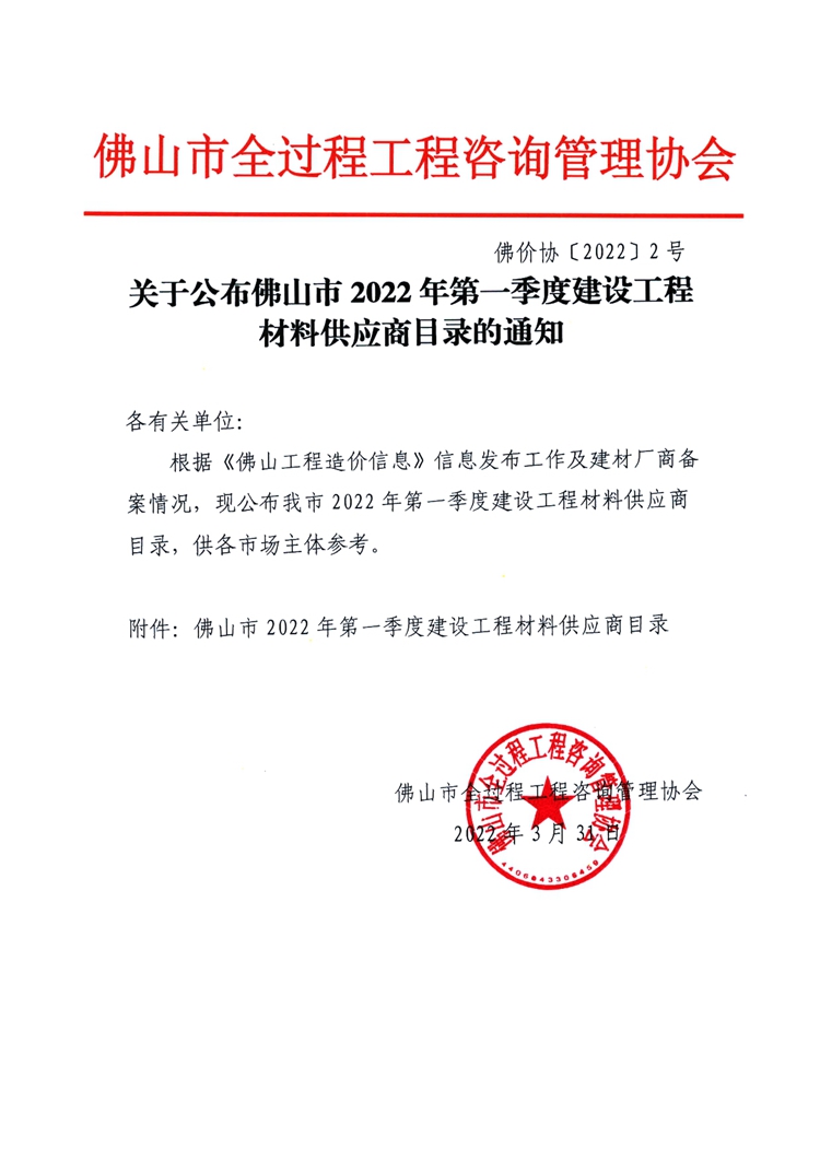 關于公布佛山市2022年第一季度建設工程材料供應商目錄的通知