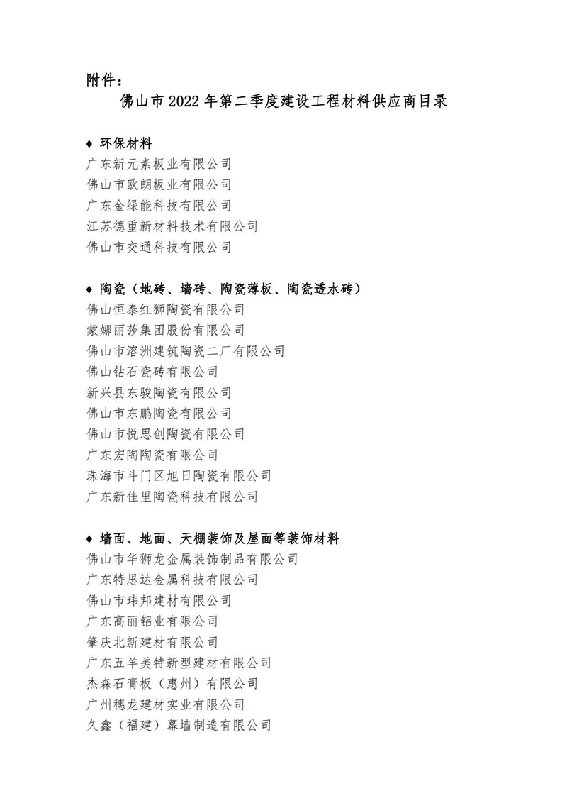 關于公布佛山市2022年第二季度建設工程材料供應商目錄的通知