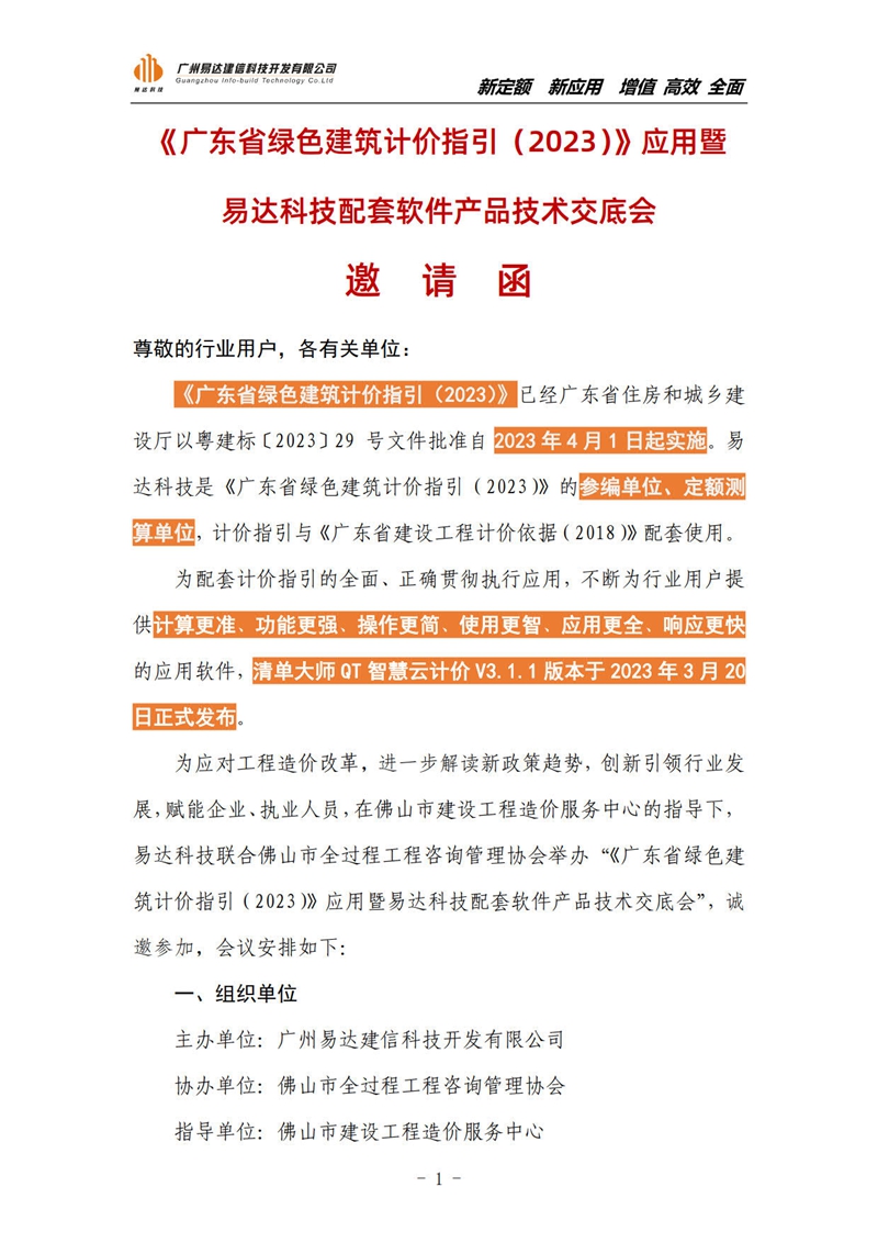 《廣東省綠色建筑計價指引(2023)》應用暨易達科技配套軟件產品技術交底會邀請函