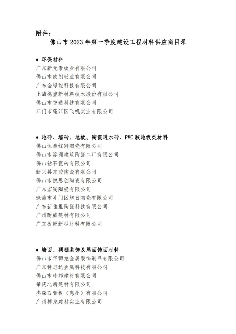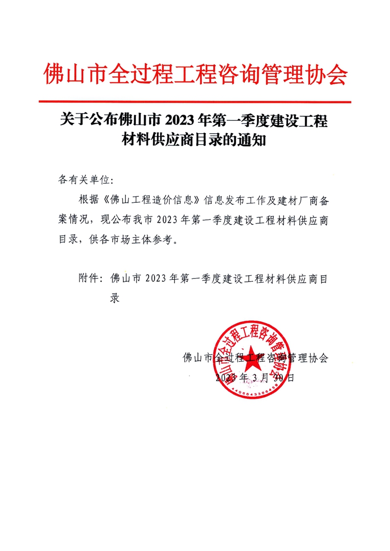 關于公布佛山市2023年第一季度建設工程材料供應商目錄的通知