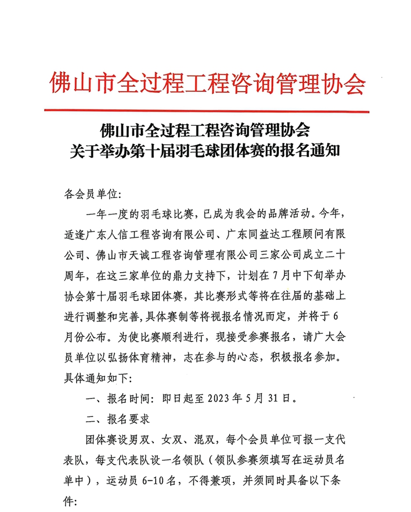 佛山市全過程工程咨詢管理協會關于舉辦第十屆羽毛球團體賽的報名通知