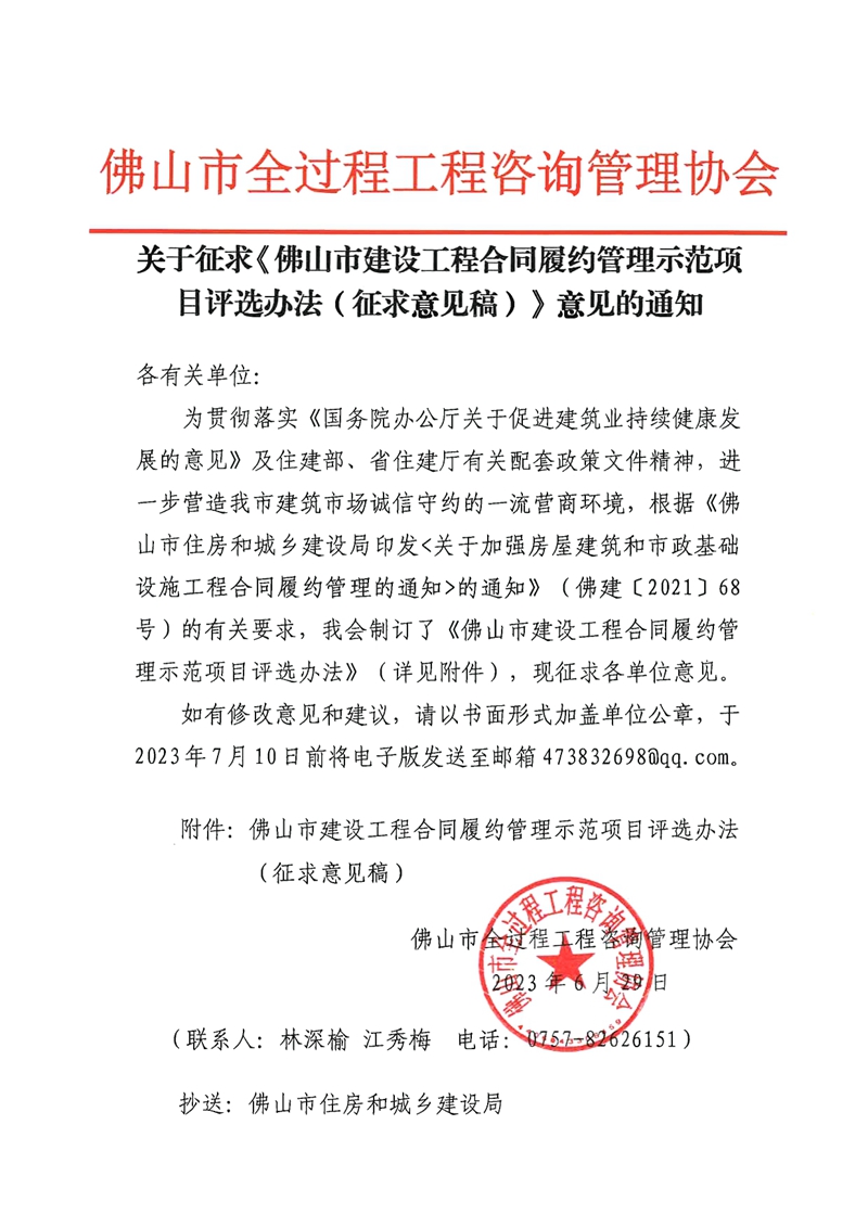 關(guān)于征求《佛山市建設(shè)工程合同履約管理示范項(xiàng)目評(píng)選辦法(征求意見(jiàn)稿)》意見(jiàn)的通知