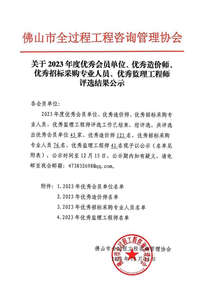 關于2023年度優秀會員單位、優秀造價師、優秀招標采購專業人員、優秀監理工程師評選結果公示