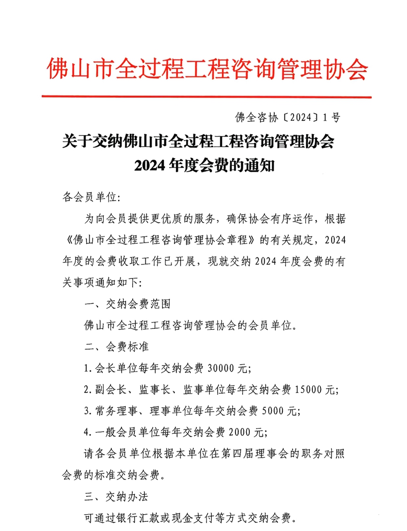 關于交納佛山市全過程工程咨詢管理協會2024年度會費的通知