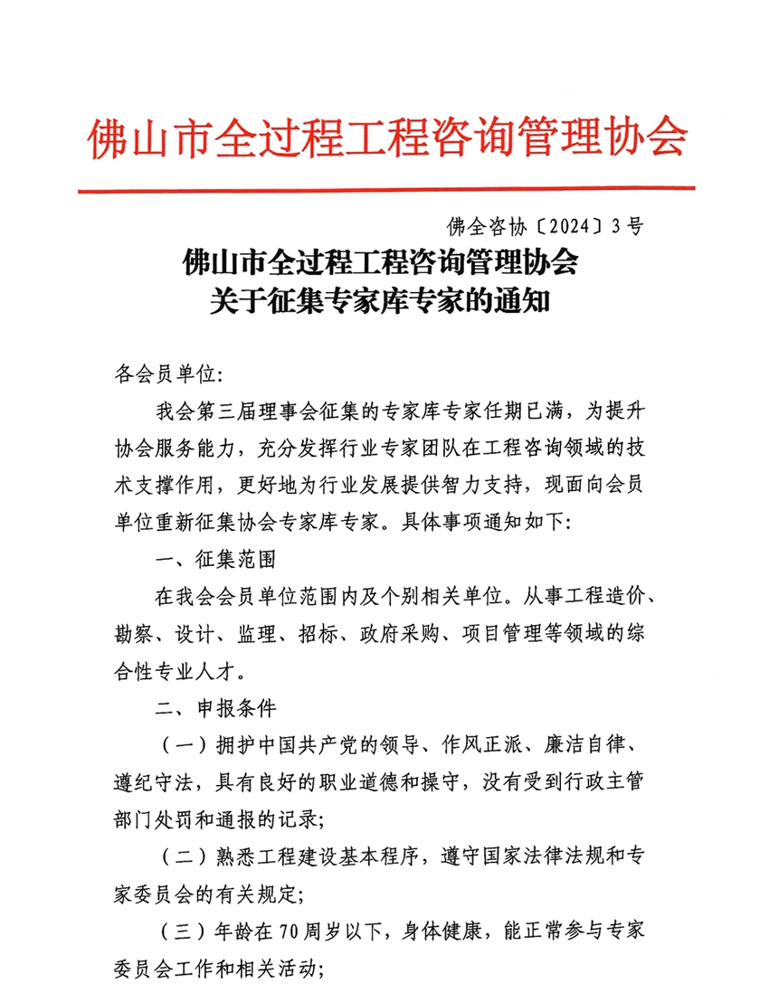 佛山市全過程工程咨詢管理協會關于征集專家庫專家的通知