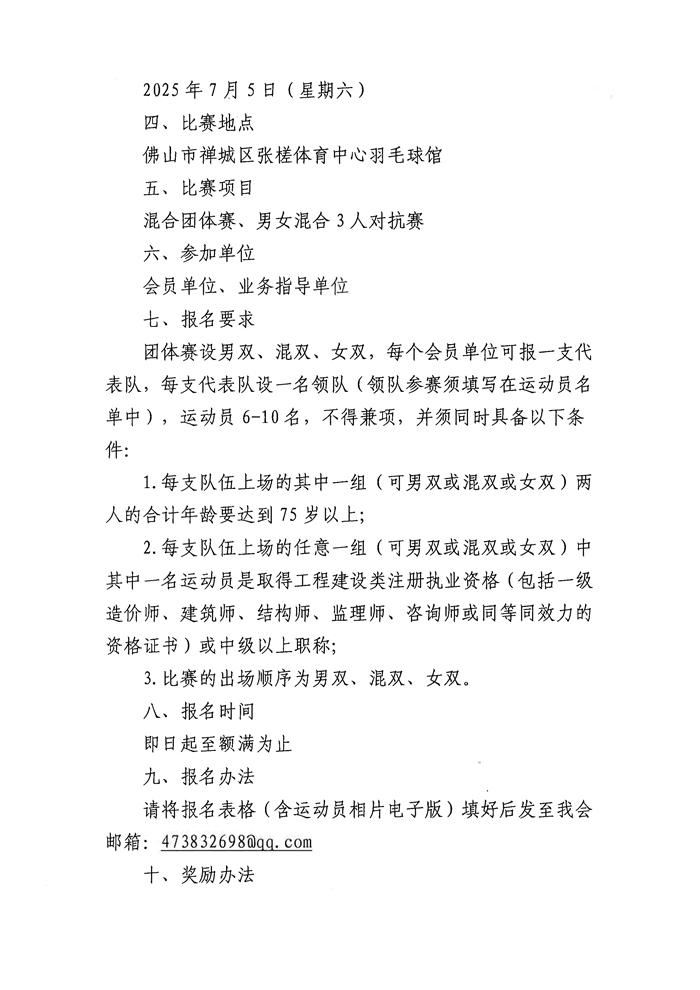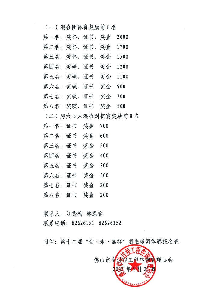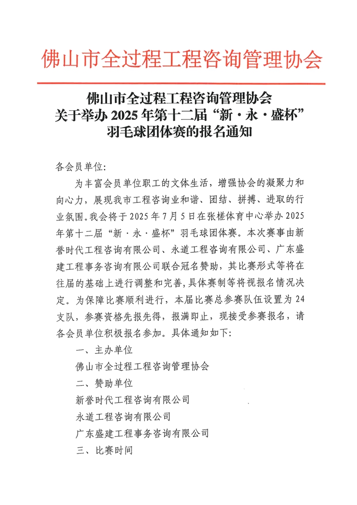 佛山市全過程工程咨詢管理協會關于舉辦2025年第十二屆“新·永·盛杯”羽毛球團體賽的報名通知