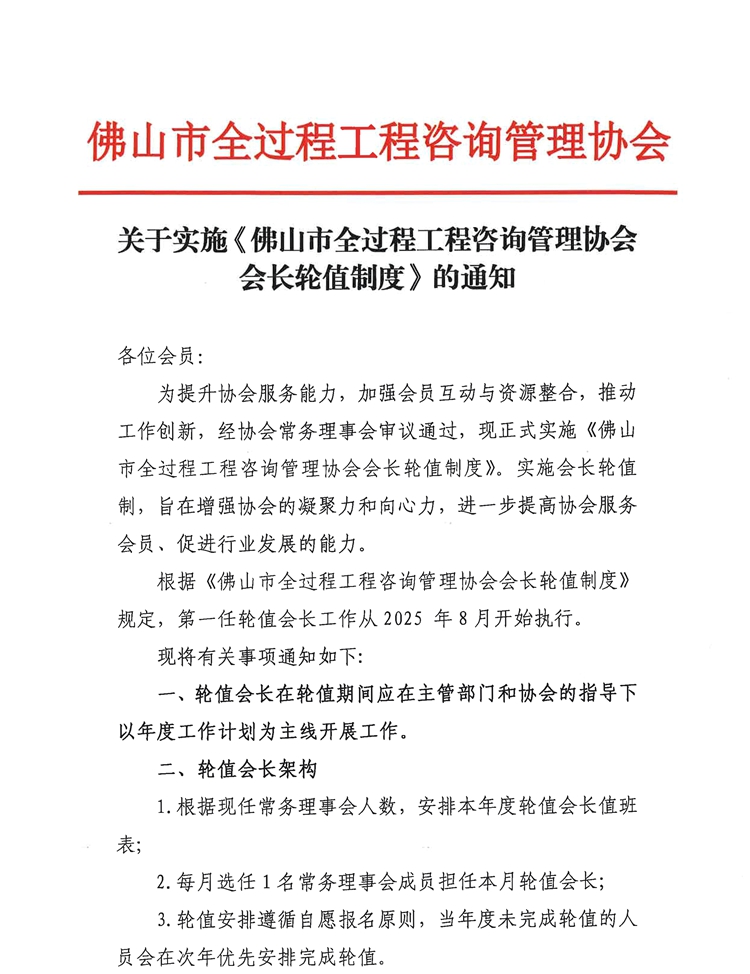 關(guān)于實(shí)施《佛山市全過(guò)程工程咨詢管理協(xié)會(huì)會(huì)長(zhǎng)輪值制度》的通知
