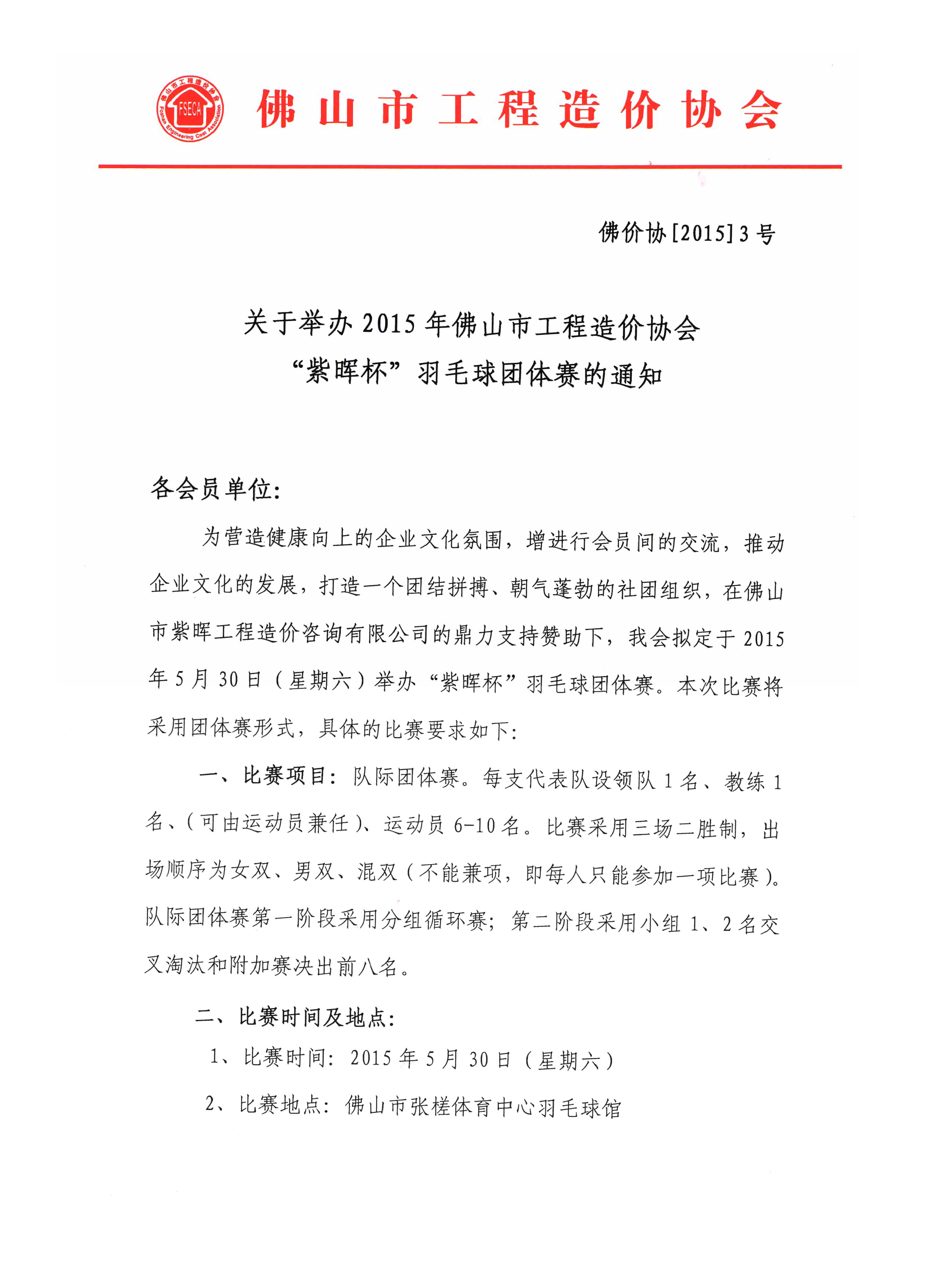 關于舉辦2015年佛山市工程造價協會“紫暉杯”羽毛球團體賽的通知