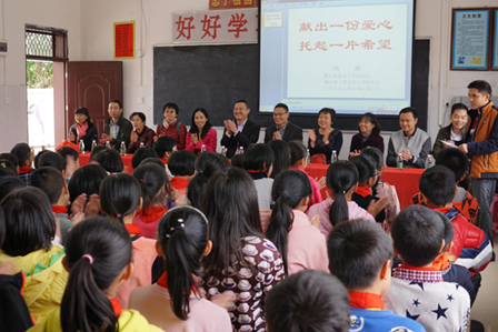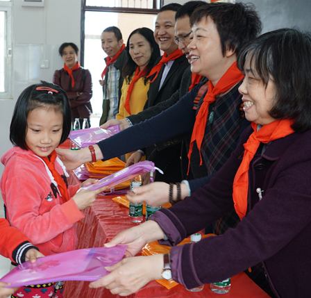 隨后大家前往沙洲小學,開展主題為“獻出一份愛心 托起一片希望”的捐書助學活動。我們向沙洲小學的教工贈送了黨的十九大報告和《中國共產黨章程》,傳達了黨的十九大精神;向沙洲小學捐贈了一批圖書,搭建圖書漂流閣;向當地在讀的所有小學生捐贈了每人一套的學習用品,勉勵學生們要珍惜現有的教育資源好好學習,懂得感恩,報效祖國、報答父母,希望通過我們的綿薄之力讓沙洲村的每個孩子能感受書香的潤澤、看到更廣闊的世界。“贈人玫瑰,手有余香”,通過這樣簡單而隆重的扶貧助學送溫暖,我們收獲了孩子們一份份純真干凈的笑容,他們也通過戴紅領巾的方式表達了他們的感謝,狹小的課室里響起了一次又一次雷鳴般的掌聲。