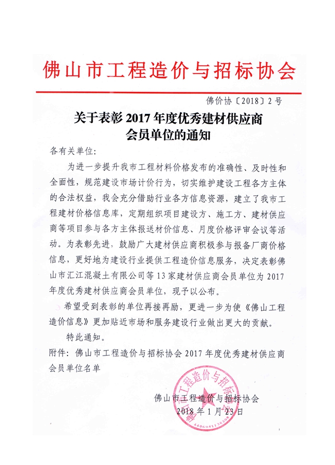 關(guān)于表彰2017年度優(yōu)秀建材供應(yīng)商會員單位的通知