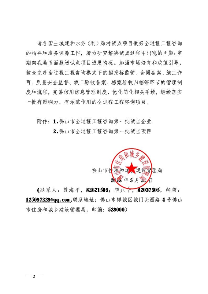 佛山市住房和城鄉建設管理局關于公布佛山市全過程工程咨詢第一批試點企業和試點項目的通知