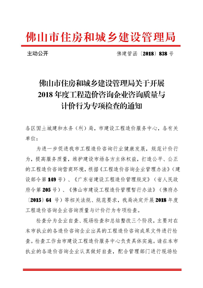 佛山市住房和城鄉(xiāng)建設(shè)管理局關(guān)于開展2018年度工程造價(jià)咨詢企業(yè)咨詢質(zhì)量與計(jì)價(jià)行為專項(xiàng)檢查的通知