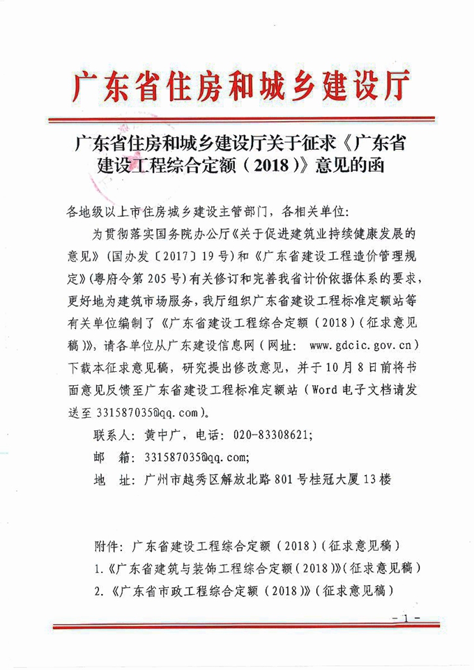 廣東省住房和城鄉建設廳關于征求《廣東省建設工程綜合定額(2018)》意見的函