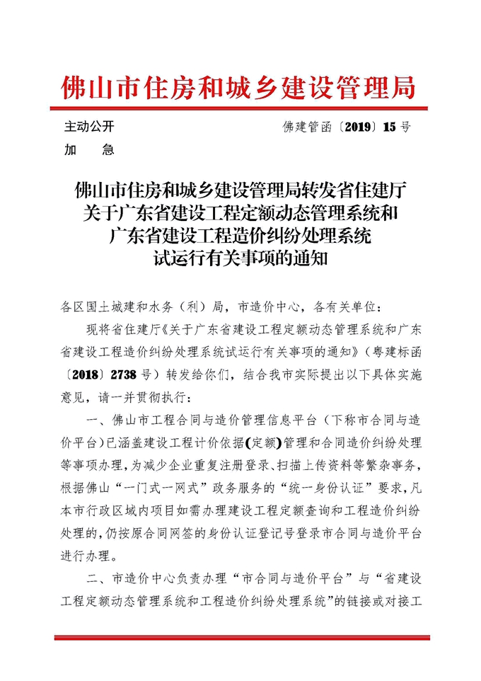 佛山市住房和城鄉建設管理局轉發省住建廳關于廣東省建設工程定額動態管理系統和廣東省建設工程造價糾紛處理系統試運行有關事項的通知