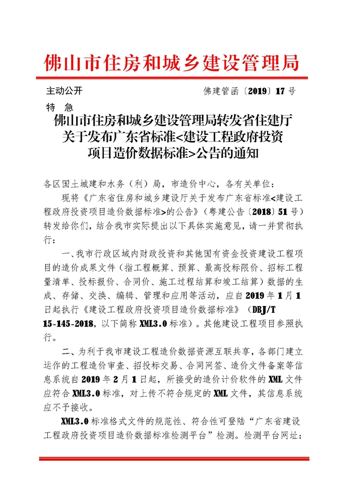 佛山市住房和城鄉建設管理局轉發省住建廳關于發布廣東省標準<建設工程政府投資項目造價數據標準>公告的通知
