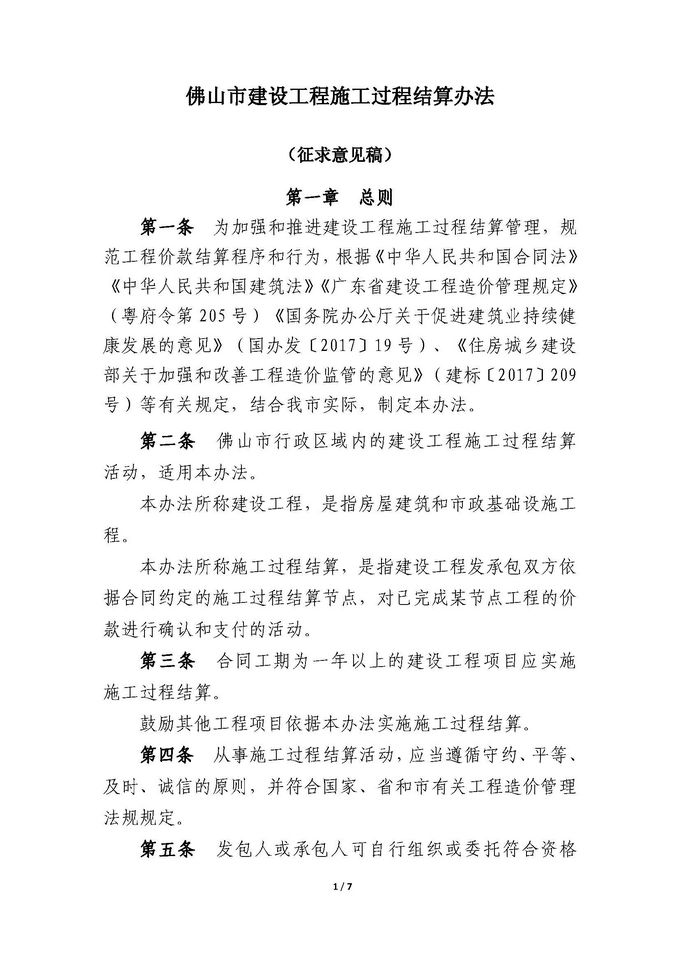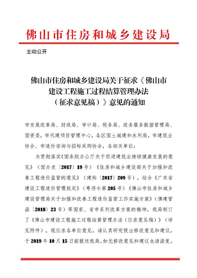 佛山市住房和城鄉建設局關于征求《佛山市建設工程施工過程結算管理辦法(征求意見稿)意見的通知