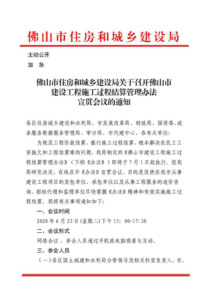 佛山市住房和城鄉建設局關于召開佛山市建設工程施工過程結算管理辦法宣貫會議的通知