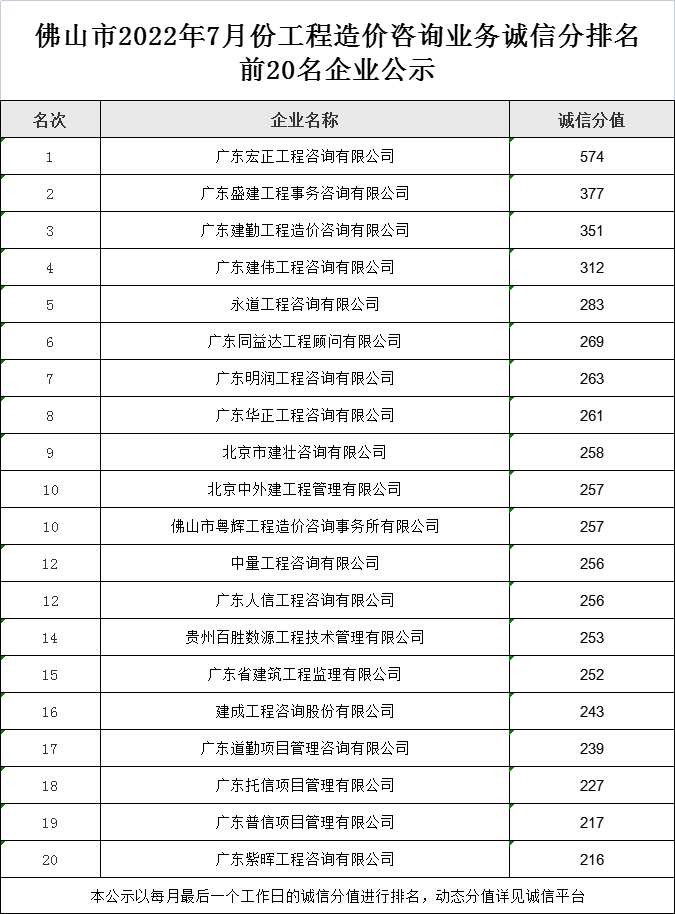 佛山市2022年7月份工程造價咨詢業(yè)務誠信分排名前20名企業(yè)公示