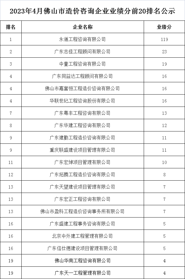 2023年4月佛山市造價咨詢企業業績分前20排名公示