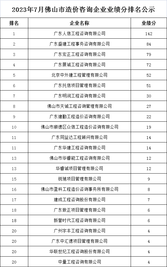 2023年7月佛山市造價咨詢企業(yè)業(yè)績分排名公示