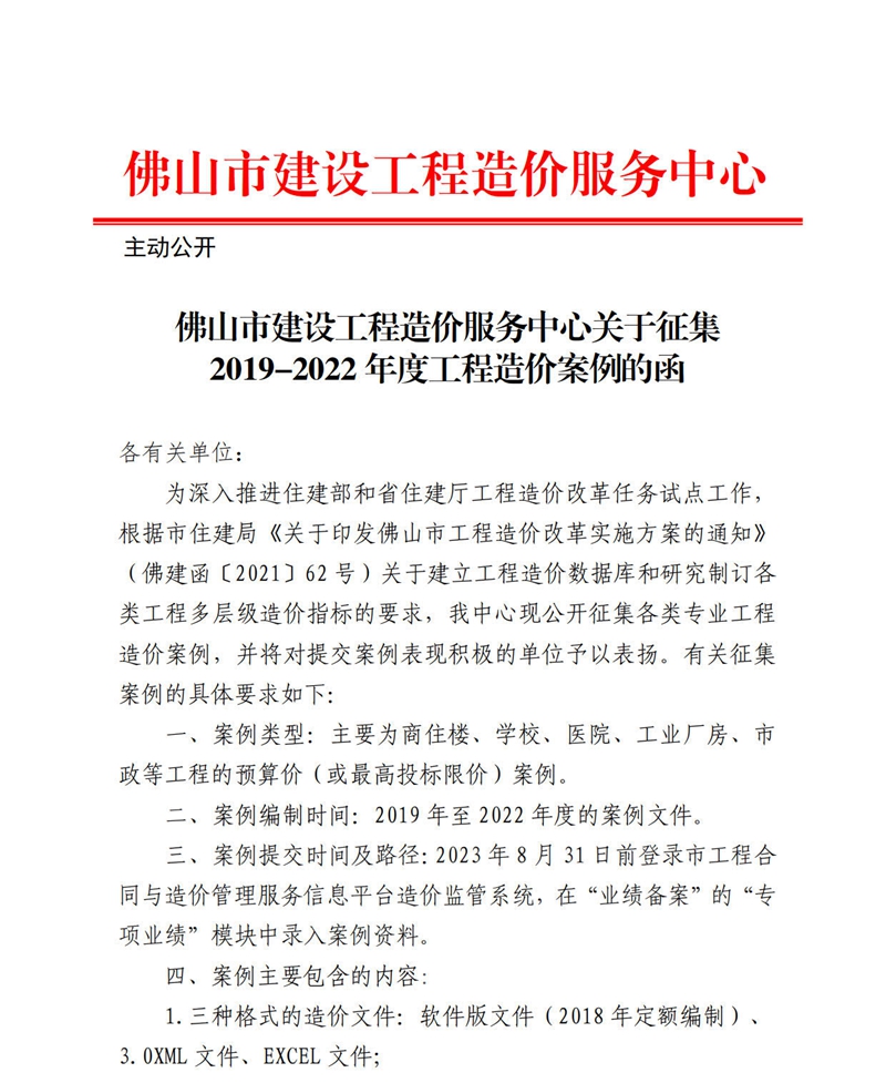 佛山市建設工程造價服務中心關于征集2019-2022年度工程造價案例的函