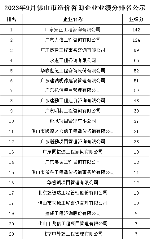2023年9月佛山市造價咨詢企業(yè)業(yè)績分排名公示