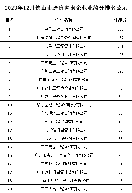 轉(zhuǎn)發(fā) | 2023年12月佛山市造價(jià)咨詢企業(yè)業(yè)績(jī)分排名公示