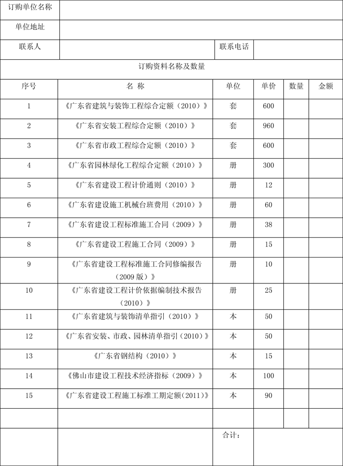 廣東省建設工程計價依據(2010)等資料征訂回執表