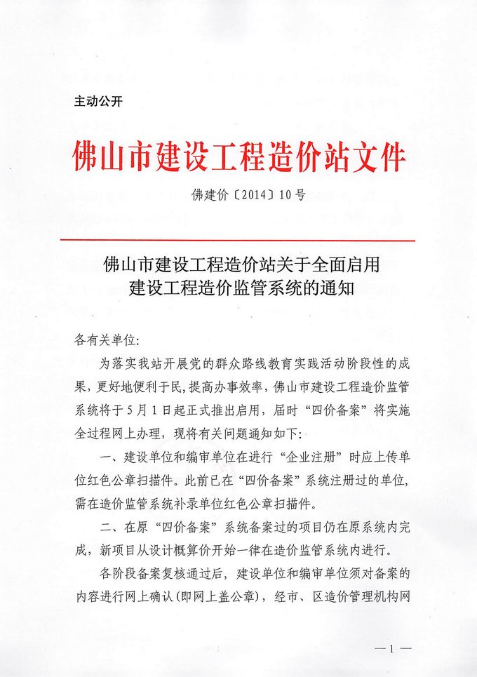 佛山市建設工程造價站關于全面啟用建設工程造價監管系統的通知