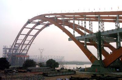 昨日上午,近百名工程人員在南岸現場進行試轉前的最后檢查。10時30分,完成了牽引力加載后,項目負責人發布了南岸拱肋的試轉指令。至下午3時,南岸重達1.48萬噸的拱肋一共轉動了90度。由于是初次平轉,為了慎重起見,原計劃平轉過程需要20多個小時,但實際上只用了4個多小時,平轉時間大為縮短。